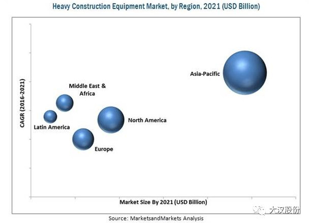 據MarketsandMarkets預測,重型建筑設備市場規(guī)模將從2016年的1291.1億美元增長到2021年的1806.6億美元,估計復合年增長率為7.0%。預計重型建筑設備市場將由于城市化程度提高、基礎設施和工業(yè)部門的大規(guī)模投資以及新興經濟體的建設活動增加而高速增長。